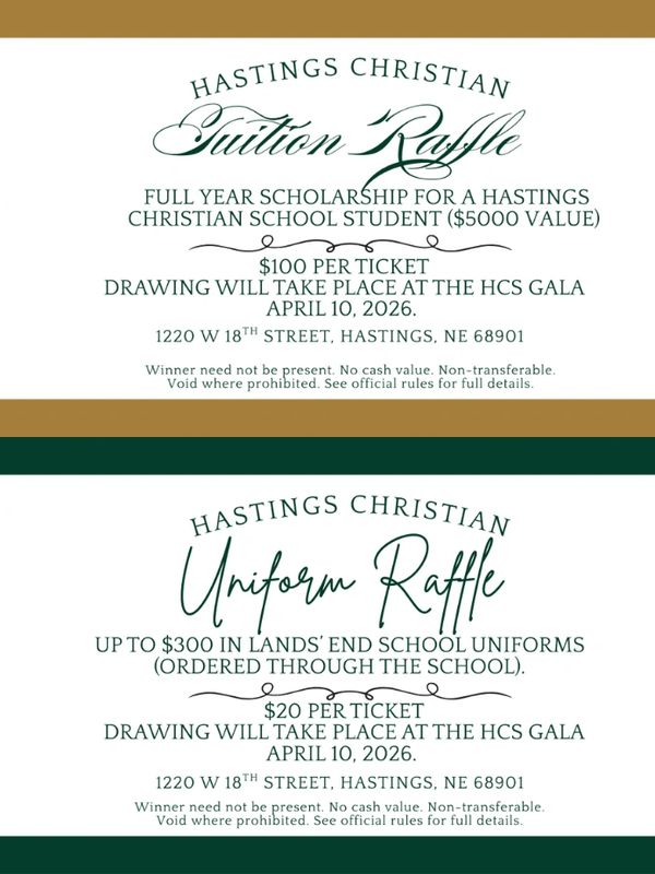 All raffle proceeds benefit Hastings Christian School and its educational programs.